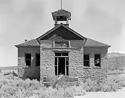 The Battlement Mesa Schoolhouse, located at 7201 300 Road, is listed on the National Register of Historic Places. The rear portion of the building was built in 1897 with stone from a local quarry. The front portion was added in 1907, also using stone from the same quarry. By the late 1940s, the building was no longer used as a schoolhouse but was used for community gatherings and events. However, the local population declined, and the schoolhouse fell into disuse and was looted and vandalized.[5] In 2003, the State Historical Fund awarded a grant to The Grand Valley Historical Society to restore the school building.[6]