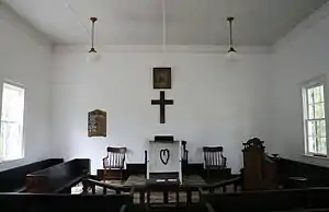 Upon entering the church, a single aisle leads through the center of the nave to the chancel, which is centered on the northwest wall of the church. Simple, stained pews fill the nave of the church. The chancel is raised on a pentagonal platform which is surrounded on three sides by a low communion rail with square balusters. The ends of the communion rail are accented with turned balusters. A second square platform is centered atop the lower on which the pulpit is situated. The walls of the church are covered in plaster with a broad base board and milled crown molding. The ceiling is covered with tongue-in-groove boards. A reed organ, produced by the Beckwith Organ Company of Chicago, IL sits to the side of the chancel.