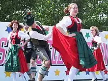 When they travel, the Bavarian Schuhplattlers take not only their costumes, but a wide assortment of props—their scythes, axes, saws, hammers, chisels, lanterns, a Maibaum (maypole) for their special "May Day" dance, and in many cases a massive log or two for the Holzhackertanz (Wood Choppers Dance). As well, the audience delights to see and hear the girls playing a variety of traditional folk songs on precisely tuned cowbells. "Edelweiss" and the "Kufsteinlied" are two songs of the many they have in their repertoire.
