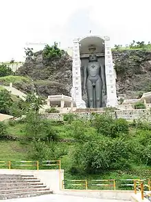 The 84 ft (26 m) tall megalithic statue (carved out of a single rock) of Lord Rishabhadeva (the first Tirthankara and founder of Jainism) is situated at a height of 1,219.4 m (4,001 ft), in the middle of the Satpura range.[3][5] It was created early in the 12th century.[6][7][8] The statue is supported from the back unlike the Gommateshwara statue of Lord Bahubali at Shravanabelagola, Karnataka. Along with the statue, the area has a complex of eleven temples.[2]