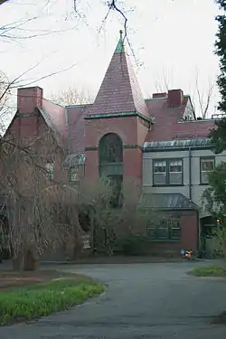 The Bayley House stands in a residential area roughly midway between the villages of Newtonville and Newton Corner, on the south side of Fairmont Avenue, a short way west of its junction with Centre Street. It is a large 2+1⁄2-story building, built of brick, freestone, red slate, and wood. It has irregular and asymmetric massing typical of the Queen Anne period, including a tower with steeply pitched pyramidal roof at one corner. Its main gables are adorned with stucco and half-timbering. A single-story porch extends around parts of the building, with balustrades; a porte-cochere provides access to the main entrance via a semicircular drive. The original carriage house, located at the southwest corner of the property, was torn down in the 1930s when that corner of the lot was sold off and a house was built on the site (on Lombard Street). The original lot extended east to Centre Street, three houses were built in the 1920s on those perimeter lots along Centre St, an additional two houses were built on perimeter lots on Lombard St. in the 1930s. The current owners added a freestanding garage in 2018. The landscape design of the property is said to have been done by William Manning, working for Frederick Law Olmsted.[2]
