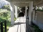Tunnels 1 and 2 bracket the present-day 22nd Street station. Tunnel 1 is just north of the station, and Tunnel 2 is south. Both tunnels are cut through Potrero Hill. Tunnel 2 is the only one of the five tunnels built with twin bores to accommodate four tracks, although the western bore is currently closed. The western bore was built because a high concrete retaining wall was needed to support a city street running alongside that second tunnel.[1] Tunnel Top Park, at 1100 Pennsylvania Avenue, is within the Caltrain-owned right-of-way. These two tunnels were bored through mostly serpentinite rock with clay seams.[1]