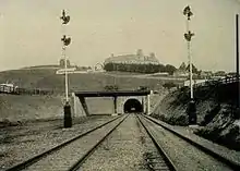 By May 1905, good progress was being made, as workers excavating the tunnel had found "nothing harder than sand and earth", but they were forced to wear rubber clothes due to the damp conditions.[36] Two shifts of work were started in June, and the stone blocks to be used in the portals had arrived at Tunnel 5.[37] By July, work on the final tunnel (later designated Tunnel No. 3) had started, and SP General Manager E.E. Calvin confidently predicted all tunnels would be completed in 1906.[29] Heavy rain during February 1906 damaged the roadbed between South San Francisco and San Bruno when the final stages of construction were about to commence.[38]