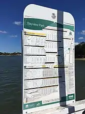 The Bayview Park reserve, along with the wharf, was opened in 1980.[1] Ferry services to the wharf were mostly run by private ventures, with Matilda Cruises operating its Darling Harbour–Homebush Bay service to the wharf until October 2005.[9] Palm Beach Ferries replaced Matilda Cruises services to the wharf afterwards with their new Darling Harbour–Cape Cabarita and Bayview Park service,[10] though decommissioned the service altogether a year later, after it "failed to attract sufficient patronage to be economically viable."[9] In September 2006, after requests from the constituents of Drummoyne, and its member Angela D'Amore in State Parliament,[11] Sydney Ferries began servicing Bayview Park as part of its Parramatta River route, serving as a terminus on its own dedicated limited-stops and shuttle pattern on the route.[12][13] Sydney Ferries serviced the wharf for seven years.[14] In October 2013, despite a redevelopment of the wharf enlarging the size of the pontoon to house shelter and seating, Bayview Park was decommissioned from the Sydney Ferries network, alongside Balmain West, both due to low patronage.[15][16] In the last year of the service, Sydney Ferries saw a weekly average patronage of 28 passengers, compared to 870 weekly passengers at Cabarita, the closest ferry wharf to Bayview Park.[17] The wharf's closure was not without controversy, sparking a political row between the Minister for Transport Gladys Berejiklian and the Minister for Drummoyne John Sidoti.[15][18][19]
