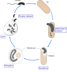 Bdellovibrio life cycle. The Bdellovibrio attaches to a Gram-negative bacterium after contact, and penetrates into the prey's periplasmic space. Once inside, elongation occurs and progeny cells are released within 4 hours.[6]
