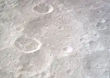 ![]() Oblique view of Bečvář from Apollo 17, facing north. Bečvář X is at top near center, Bečvář Q is below left of center, and Bečvář J is partially visible in lower right. | |
