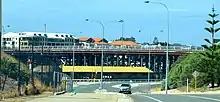 It crosses under the Fremantle Traffic Bridge and turns uphill next to the Fremantle Railway Bridge.