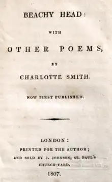 Smith's first published work, Elegiac Sonnets (1784), had been an influential early text in the literary movement which would come to be known as Romanticism.[5] Smith's sonnets differed from previous sonnets in both subject matter and tone.[31] Smith wrote about her personal troubles, rather than love, and created an overall feeling of bleak sadness.[5] She also used less complex rhyme schemes, to write sonnets that were sometimes criticized for their simplicity[32] but have also been seen as pursuing more natural, more direct poetic language which matched the emotions she expressed better than the artificial language common to Italian sonnets.[33] This pursuit of simple, direct expression is among the reasons Smith is classed as a Romantic poet, and partly inspired the poetic innovations of William Wordsworth and Samuel Taylor Coleridge's Lyrical Ballads (1798).[34] Beachy Head challenges some conventions of Romantic poetry. For example, the poem evokes the Romantic idea of individual genius, but in a way that is "inflected by a desire to challenge social constructions of individuality."[35]