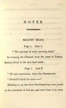 Smith composed sixty-four notes to accompany the poem,[9] which appeared collected as endnotes in the first edition.[16] These notes provide, among other details, scientific names for plants and animals; descriptions of historical events; and explanations for some of her allusions to other writers. The notes are generally considered an important part of Smith's overall poetic approach.[4][17][12] The notes establish Smith's position as an authority in areas ranging from historical contexts, to geological insights, and scientific examinations of wildlife.[17] Smith's invocation of herself as an expert has been considered particularly impressive since these notes were composed after she sold her personal library, and thus the many facts and quotations included are based solely on her own memory; some quotations are, as a result, not word-perfect, but in general Smith's notes are remarkably accurate. By introducing academic topics, the notes also extend the boundaries of poetry, tying science to poetry in a symbiotic relationship. The combination of approaches mirrors the poem's presentation of the cliff itself as, in one scholar's words, "complex, many-layered, unfinished, and caught up in a continuous process of becoming," by describing the landscape in multiple ways simultaneously.[4]