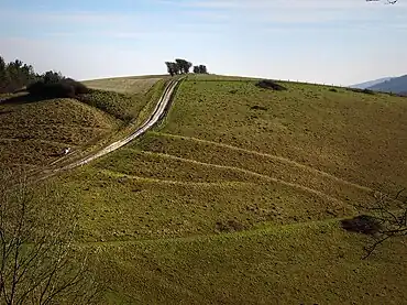 The hillfort is situated on the top of the hill and is defined by a single rampart and a flat-bottomed ditch,[3] which survives as a low bank up to 6 metres (20 ft) wide.[4] The rampart was originally faced with timber,[3] with timber palisades acting as retaining walls on both the inside and the outside.[5] The rampart infill was built with a mixture of soil and chalk,[2] and is best preserved on the south side. On the east and west sides, erosion has reduced the rampart to a scarp, with the ditch silted in to form a terrace.[1] The enclosure is roughly rectangular, with an entrance on the west side.[4] Excavations of the west entrance revealed that a large timber gate was built within the entrance causeway,[1] and uncovered two penannular gold rings (incomplete or unclosed rings). It is possible that there was a second entrance on the northeast side, where a modern track crosses the rampart.[3] Investigation of the interior revealed a general lack of features except for traces a number of small four- and six-posted structures.[6] These are interpreted as having been raised granaries.[2]
