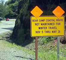Bear Camp Road is a rugged, narrow, crooked road, which is extremely dangerous to travel on during the winter. Numerous motorists have been stranded for days or weeks on Bear Camp Road or one of the many gravel roads that branch off from it. Dewitt Finley and James Kim both died after being stranded on the road in winter.