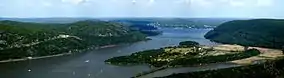 View of Bear Mountain Bridge from the Perkins Memorial Drive mountain summit. The bridge enters the northern edge of the park, the only portion that is in Orange County.