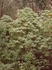 Whilst in no way related, the first impression of a healthy stand of blanket tree is strongly reminiscent of the rhododendrons of the Himalayas and China. This is due to similar growth habit, leaf arrangement and shape and is consistent with a plant which grows in the middle vegetation layers, and which has the role of shading the ground.