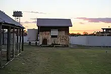 While not widely used across Queensland, the method of pisé construction proved valuable in western Queensland, where building materials were difficult to come by. The limited vegetation provided insufficient material for construction, and while a sandstone quarry existed near Birdsville, allowing residents there to construct stone buildings, Bedourie, surrounded by desert sandhills and stony desert tableland soils, lacked a local stone cache. Pisé construction had several advantages, being "less than one-half the cost of Brick or Wood", "equal in appearance and strength to any stone building", and its material was "always procurable".[58] Pisé had particular benefits in the arid climate of western Queensland: the buildings were not prone to deterioration, and were "cool in summer, warm in winter". A wide array of pisé buildings were constructed in the Channel Country, including Birdsville's first hotel; Windorah's original police station (1884); hotels in Jundah, Windorah, and Canterbury; and homestead buildings at Diamantina Lakes, Cullwilla, Daroo, Palpara, Mornay, St Albans, Toorajumpa, and Monika. St Paul's Anglican Church built in 1874 at Cleveland was also rumoured to be a pisé building, beneath a cement-rendered facade. Most of the pisé buildings did not survive, however. Two of the most renowned, the Windorah hotel and the JC hotel in Canterbury, burned down in 1954 and melted after the roof was removed, respectively.[59][60][61][62][63][64][65][1]