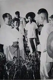 During the conference, Mao Zedong gave many speeches on the issue of people's communes, including how to define, organize and benefit from people's communes. In April 1958, the first people's commune, Chayashan Sputnik Commune, was built in Henan Province.[31] During the conference, Mao read the sputnik commune's trial constitution and wrote: "this constitution seemed to be sent to every province and prefecture for reference."[23] It defined the people's commune as a social grassroots organization, which aimed to consolidate socialist system, create conditions and prepare for transitioning to the communist system.[32] In Mao's conclusion, people's communes were based on "socialist system plus communist ideology."[26] People's communes with socialist nature would eradicate the bourgeoisie vestiges, for instance, private plot and private livestock, step by step, and realize communist society within a few years.[26] Mao also suggested a specific approach to organize communes. It was put forward by the people's commune in Xushui Prefecture. The slogan is "organize along military lines, working as if fighting a battle, live in a disciplined way (Chinese: 组织军事化、行动战斗化、生产纪律化)."[26] Mao was conspicuously satisfied with the slogan, though he did not force nationwide prefectures to imitate it. He said that the slogan was virtually about the issue of organization and democracy in people's communes.[26]