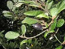 The fruit is variable from one species to other' in some species it is a drupe, large and globose green, 12 cm in diameter with a tip at the apex. In other species, the fruit is an erect, plum-like, dark purple or sometimes elliptical to ovoid drupe, dark purple when ripe, and covered in a waxy bloom. In others, the fruit is a black, round drupe with a glaucous bloom, with a single seed inside. Seed dispersal for many Beilschmiedia species is by birds that swallow them, so they are shaped to attract the birds. The one-seeded fruits are an important food source for birds, including being a favorite food of the native pigeons in New Zealand.