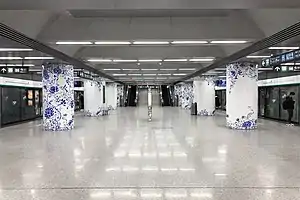 Both the line 8 and line 10 stations have underground island platforms. The line 8 platforms are located a level below the line 10 platforms.