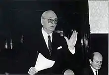 Király was well regarded in the United States, as the U.S. had been supportive of the Nagy-led government to which Király had been loyal. He arrived speaking good English, having taught himself through an English-Hungarian dictionary while in prison. He enrolled in Columbia University earned a Master's degree in history in 1959, and a Ph.D. in 1966.[15] His doctoral dissertation topic was "1790: Society in Royal Hungary," and was later revised and published as Hungary in the Late Eighteenth Century: The Decline of Enlightened Despotism (New York: Columbia University Press, 1969). The supervisor for his dissertation was Robert A. Kann, an Austrian-born historian at Rutgers University who spent several years as a visiting professor at Columbia.[16] Király dedicated his second book, Ferenc Deák (Boston: Twayne Publishers, 1975), to Kann, and also contributed to a Festschrift for Kann: Intellectual and Social Developments in the Habsburg Empire from Maria Theresa to World War I: Essays Dedicated to Robert A. Kann, ed. Stanley B. Winters and Joseph Held (Boulder: East European quarterly; distributed by Columbia University Press, 1975). From 1964 he taught Military History at Brooklyn College, and became chairman of the history department. He retired as Professor Emeritus in 1982.[2][7] During his tenure he served as director of the Society In Change Program on East Central Europe, supervised Brooklyn College Press (the College's Publishing House), and was an adviser to the Brooklyn College Military History Club. The Brooklyn College Bela K. Kiraly Award, awarded to undergraduate students for outstanding work in modern history, bears his name.