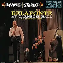 Belafonte at Carnegie Hall is a live double album by Harry Belafonte issued by RCA Victor.[5] It is the first of two Belafonte Carnegie Hall albums, and was recorded on April 19 and April 20, 1959. The concerts were benefits for The New Lincoln School and Wiltwyck School, respectively.[6] The album stayed on the charts for over three years.[3]