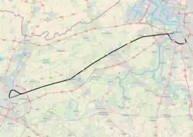 The Belgian railway line 59 is a railway line in Belgium connecting Antwerp with Ghent. It was opened between 1844 and 1847. Until 1970, the eastern terminus of the railway was a station on the left bank of the river Scheldt, opposite the city centre of Antwerp. Since 1970, the railway is connected to Antwerp central station by a rail tunnel under the Scheldt. The total length of the line between Antwerpen-Berchem and Gent-Dampoort (the section between Gent-Dampoort and Gent-Sint-Pieters is part of line 58 Ghent – Eeklo) is 55.8 km.