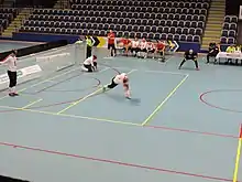 Australia in a penalty situation seeking to defend a Belgium throw, at the IBSA World Games, Seoul, South Korea (May 2015).