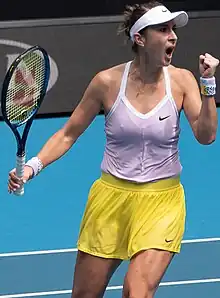 Despite being back outside of the top 50, Bencic had a strong start to 2019. She reached the semifinals at the Hobart International and made it to the third round at the Australian Open, losing to eventual finalist Petra Kvitová.[67][68] Her next breakthrough came at the Dubai Tennis Championships. As an unseeded player, she defeated four top-ten players in the last four matches to win her third WTA singles title and second at the Premier 5-level. In order, she recorded wins over No. 9 Aryna Sabalenka, No. 2 Simona Halep, No. 6 Elina Svitolina, and No. 4 Petra Kvitová, all in three sets and two of which in a final set tiebreak.[69] The title helped her rise to world No. 23.[25] Bencic continued her win streak with a semifinal appearance at the Indian Wells Open. She defeated two more top-ten players in No. 1, Naomi Osaka, and No. 5 Karolina Plíšková before losing to No. 8, Angelique Kerber.[70][71] In the lead-up to the French Open, Bencic produced another Premier Mandatory semifinal at the Madrid Open. She recorded another world-number-one win over Osaka,[72] but could not defeat Halep in a tight three-set match.[73] After the tournament, she moved up to No. 15.[25] At the French Open, she advanced to the third round for the first time, where she was defeated by No. 24 Donna Vekić. During the grass-court season, Bencic made her second WTA final of the year at the Mallorca Open. After defeating top seed and world No. 6 Kerber,[74] she finished runner-up to Sofia Kenin, after having three match points in the second set.[75] Like at the Australian Open and the French Open, she lost in the third round at Wimbledon.[76]