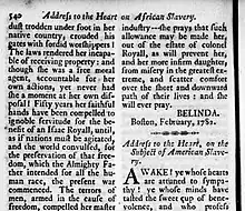 - ↑ Belinda (June 1787). "Petition of an African Slave". The American Museum or Repository of Ancient and Modern Fugitive Pieces & C. William Carey. 1 (6): 538–540 – via Internet Archive.