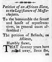 - ↑ Massachusetts House of Representatives (19 February 1783). "On the petition of Belinda, an African". Massachusetts Anti-Slavery and Anti-Segregation Petitions, Harvard University. Retrieved 22 February 2023.