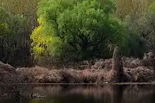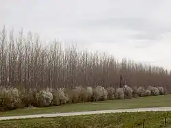 The belt between the inner and outer embankments, and the river, is planted with the forest trees. The forest acts as an obstacle for the high waters and strong winds, protecting the inland settlements (Borča, Kovilovo, Padinska Skela). It forms a sanitary and hygienic belt between the river and the human habitats, while the oxygen production is beneficial even for the settlements across the Danube. The most abundant tree species is the poplar. Poplars have been systematically planted and constantly re-planted as after 20 to 25 years they are being cut for the industrial production. The poplar is known for its fast growth and almost sponge-like absorption qualities, but the water is also absorbed by the humus layer which developed in time on the forest floor.[7] The natural forests are typical gallery forests, consisting of willows and poplars. The cultivated trees are hybridized Canadian poplar.[3]