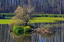 As an elongated floodplain along the Danube, Beljarica is a typical green corridor.[1] The area includes two sizable flood zones, Crvenka (main Beljarica proper) and Kožara. The marshland represents a mosaic of bogs, streams, islands, oxbows, meanders and lush forests and makes a natural riparian zone which receives the surplus of water during the high water level of the Danube, thus preventing the flooding downstream.[2][3] It is not preventing flooding only of its direct hinterland (some 340 km2 (130 sq mi) Pančevački Rit), but also parts of Zemun, New Belgrade and even lowlands upstream the Sava river from its mouth into the Danube.[5][6]