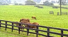 The farm breeds American Saddlebreds and Quarter Horses,[24] which are exhibited in horse shows.[25] The stallion roster includes the Champion Saddlebred, Call Me Ringo, who performed in harness at the 2010 Alltech FEI World Equestrian Games in Lexington.[26][27] A former stallion was Sultan's Great Day.[28] Sultan's Great Day was the premier American Saddlebred that stood at Belle Reve. He sired many champion performance horses, such as Great Day's Token, 1992 Junior Exhibitor Five-Gaited World's Grand Champion, Royal Scot's Curtain Call, a grand gaited mare, Simply Mahvalous, 1989 Three-Year-Old Fine Harness National Futurity World's Champion, Day By Day B.R., 1989 Two-Year-Old Five-Gaited World's Champion, and Royce, 1989 Kentucky Futurity Two-Year-Old Fine Harness World's Champion.[29]