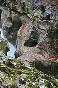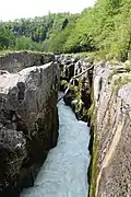 At this spot, the water of the two rivers runs underground; it was possible to cross both of them easily. Since the inception of the Génissiat Dam at Injoux-Génissiat, the level of the Rhône was raised several metres and the Perte du Rhône submerged. A smaller, similar feature, the Pertes de la Valserine, on the former border with Lancrans, is still visible.