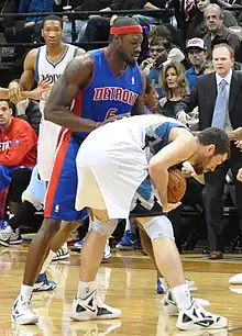 Wallace was listed at 6 ft 9 in (2.06 m), though he stated that he is closer to 6 ft 7 in (2.01 m).[30] Even though his height was more suited for the power forward position, he primarily played as center due to his size, strength and athleticism.[30] He became known for his prolific rebounding and shot blocking,[30] and was voted the NBA Defensive Player of the Year four times in five years, finishing as a close runner-up in the other season.[31] He is one of only five players to collect more blocks than personal fouls (minimum 150 games) and the only player among those to also have more steals than turnovers.[32]