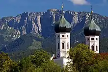 The Benediktenwand (formerly the Kirchstein) is a 1,800-metre-high (5,900 ft) mountain ridge in the Bavarian Prealps between the rivers Loisach and Isar and the Jachenau in the south and Benediktbeuern Abbey, from which it derives its name, in the north. Immediately below the North Face of the Benediktenwand is the Tutzinger Hut (1,327 m).