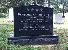 Davis's wife Agatha died on March 10, 2002. (Aged 94)[29] Davis, who had been suffering from Alzheimer's disease, died at age 89 on July 4, 2002, at Walter Reed Army Medical Center in Washington, D.C. He was interred with Agatha on July 17, at Arlington National Cemetery.[30] A Red Tail P-51 Mustang, similar to the one he had flown in World War II, flew overhead during his funeral service. Bill Clinton said, "General Davis is here today as proof that a person can overcome adversity and discrimination, achieve great things, turn skeptics into believers; and through example and perseverance, one person can bring truly amazing change".[31]