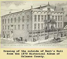Bent's Opera House, also known as Bent's Hall, is a three-story building located at 444 Main Street in Medina, New York, in the United States. The building is made of Medina Sandstone and features an opera house on the top floor. Construction began in 1864 and was completed early the next year. The building is named for Don Carlos Bent, a local farmer who owned the property and had the structure erected. A formal dedication ceremony was held on February 28, 1865, featuring remarks by a Civil War officer and patriotic pageantry.[1]