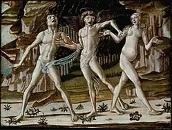 This painting, done by many artists, depicts Adam and Eve being cast out of the Garden of Eden by the archangel, Jophiel. However, Benvenuto's version stands out from the others because his depiction of Eden is far more realistic than that of other artists. He paints Eden as a lush green forest rather than a land full of a myriad of plants and animals. He expertly constructs the figures in a way that makes the subjects come alive through the intermingling of their arms and angling of their bodies.[5] Most likely painted between 1480 and 1500, this exhibits Benvenuto's later style that combines realistic backgrounds and dramatic subjects.
