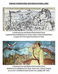 In the nationalistic style typical of the revivalist Bengal School of Art,[26] Rammanohar executed a myriad of fresco-secco in 1952-53 on the walls and the dome of Shaheed-Smarak or Martyrs'-Memorial Concert Hall in Jabalpur, depicting various episodes and landmarks in India's struggle for independence[27] starting from 1654 CE and ending with the unfurling of Indian tricolour on Independence Day in 1947 CE. These were the leftover-drawings that were to be included in the Constitution, but could not be. Of particular significance are the one depicting the Quit India Movement (pictured) which has also been published in Encyclopædia Britannica[28] and the one on Rani Durgavati, which has been credited with the very first unambiguous painting of the valiant warrior queen of the Gondwana-fiefdom of Garha-Mandla who dared to challenge Akbar's mighty army in order to safeguard her country's independence.[29][30]