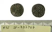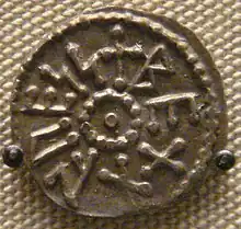 Beonna was the first of the East Anglian kings whose coinage named both the ruler and his title. His coins are larger than the earlier sceattas, but are small when compared with the pennies produced in Anglo-Saxon England several decades later. As a whole, they provide an important dateable runic corpus and may reflect a distinctive East Anglian preference for runic lettering.[30][31] Beonna had three moneyers whose names are known: Werferth, Efe and Wilred. The coins struck by Werferth are considered to be the earliest. His coins and those struck under the authority of Eadberht both contained 70% silver and were similar in type and detail, which suggests the possibility of producing a chronology for Beonna's coins, using the established sequence for the Northumbrian coins of Eadberht. However, as Eadberht's reign began in 738, several years before Beonna became king in East Anglia, the coins cannot be related to each other closely enough to construct a reliable chronology.[32]