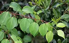 The leaves are simple, ovate to broad–ovate, alternate, palmately veined.[2][9] They are usually 3 cm to 6 cm long.[2] Leaves are soft and thin, with a hairy look-like structure in the midvein and lowest veins.[2]