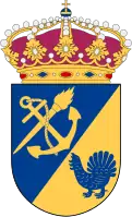 The coat of arms of the Berga Naval Training Schools 1955–1997. Blazon: "Per bend sinister azure an anchor cabled and a torch in saltire and or a cock-capercaillie, all counterchanged".[16]