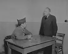 An American soldier questions a civilian from a nearby town in the Berga-Elster concentration camp.