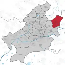 Bergen-Enkheim is a popular residential area with families and sports enthusiasts for its small-town character, excellent infrastructure, and the highest number of clubs (Vereine) in Frankfurt,[2] many of them sports clubs. Its athletic facilities include a modern track and field complex,[3] a tennis club,[4] an extensive, recently modernized indoor and outdoor public swimming and sports center,[5] and a nature preserve with small lakes and many kilometers of forested walking, running and biking paths (Enkheimer Ried). The southern side of the Berger Rücken, once covered with vineyards, is now one of Frankfurt's premier residential districts, the Berger Hang.[6]