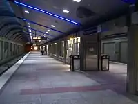 Bergenline Avenue is the only stop in the HBLR system with an underground platform. Located 160 feet below the Hudson Palisades in the former Weehawken Terminal tunnel of the West Shore Railroad,[5] it is reached by elevators traveling from street-level entrances located just north of bus bays.[6] The station was designed by FXFOWLE Architects.[7] The four porcelain enamel on steel murals that adorn the complex are entitled Between Manhattan and Meadowlands, and were created by Maria Mijares.[8][9][10]