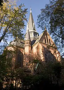 Plans for a second Protestant church, after the Marktkirche, date back to 1837, but were not realised until decades later, due to the two wars (Austro-Prussian War and Franco-Prussian War) that Prussia had to fight between 1866 and 1871.[1] Building began in 1876,[2] and was completed in 1879.[2][3] The Protestant Bergkirche was built in Gothic revival style, designed by Johannes Otzen who would write the Wiesbadener Programm. The building process was supervised by Hans Grisebach. It was named Bergkirche because it was built on a high plateau within Wiesbaden's inner city, and the surrounding quarter is named after the church. The steeple, with a slate roof, dominates the area.[3]