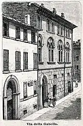 The two exposed brick facades of the main floor are each decorated with three and a half biforas and are decorated with terracotta tiles with Renaissance floral motifs due facciate in mattone a vista del piano nobile sono decorate ognuna da trei.[9]