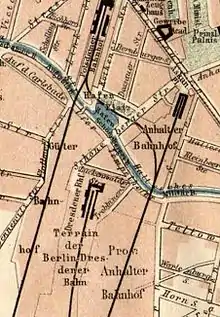 The station building was fairly small in size and inconveniently located some distance from the Berlin city centre, south of the Landwehrkanal. The surrounding area in the Tempelhofer Vorstadt quarter (today part of the Kreuzberg district) was largely dominated by railway infrastructure. Close by were the approach tracks of the larger Anhalter Bahnhof and Potsdamer Bahnhof, and their associated goods stations and locomotive depots.