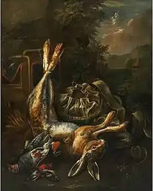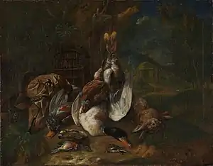 His hunting still lifes often take the form of hunting trophies displayed in a landscape. The scene often also shows some hunting implements, a hunter with a dog, or a cat.[6][7] It is possible that some of his hunting still lifes were wrongly attributed to Jan Fyt, another Flemish still life painter specialising in this genre.[2] Some sources state that de Bridt may have been a pupil of Fyt.[8] A few of his works have formerly been attributed incorrectly to other specialist painters of dead game such as Pieter Boel and Adriaen de Grijef.[9][10] Several of his game pieces were created in pairs.[11]