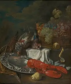 De Bridt also painted still lifes which contained some elements of the pronkstillevens, the sumptuous still lifes, which were popular in Flanders and the Dutch Republic from the 1640s. He may also have included in his game still lifes a vanitas meaning, i.e. a reflection on the vanity (futility) of all human and worldly undertakings. Both elements are present in the Still life with a lobster (1699, M – Museum Leuven) which shows the expensive plate and lobster often seen in pronkstillevens. The peeled lemon symbolising the hardships of life and the decaying fruit referencing the inevitable decay and annihilation of all things are stock symbols of 17th century vanitas paintings.[13]