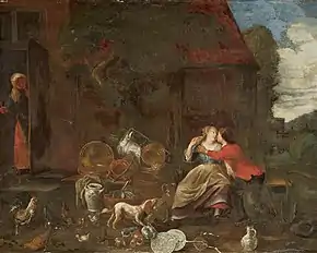 A Still life of vegetables and household goods in a farmyard by de Bridt was recorded in a private collection in St Petersburg. It depicts a man making advances on a young woman cleaning a kettle in the middle of a farmyard. The two are being spied upon by an older lady. It is possible that the man who looks older is the husband of the woman and that the young woman is the maid. Just like the other genre paintings by de Bridt, it contains an important still life component in its careful depiction of a copper kettle, barrel, colander, churn, earthenware jug, stoneware jug, wheelbarrow, cauliflower, artichoke, carrot, leek, hay, pitchfork, spoon, etc.[12]